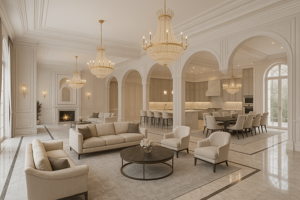 O estilo Neo-Clássico Moderno resgata elementos tradicionais como boiseries, colunas e simetria — reinterpretados com linhas puras, cores neutras e materiais contemporâneos.